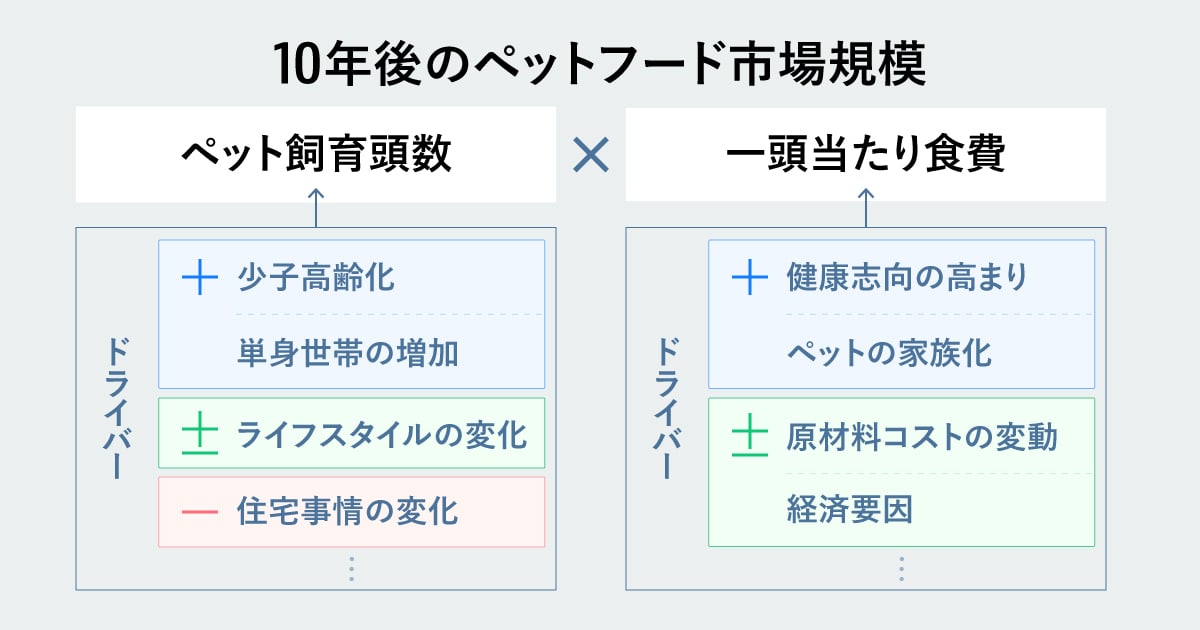 たとえば「10年後のペットフード市場の規模は?」という問いを立ててみましょう。