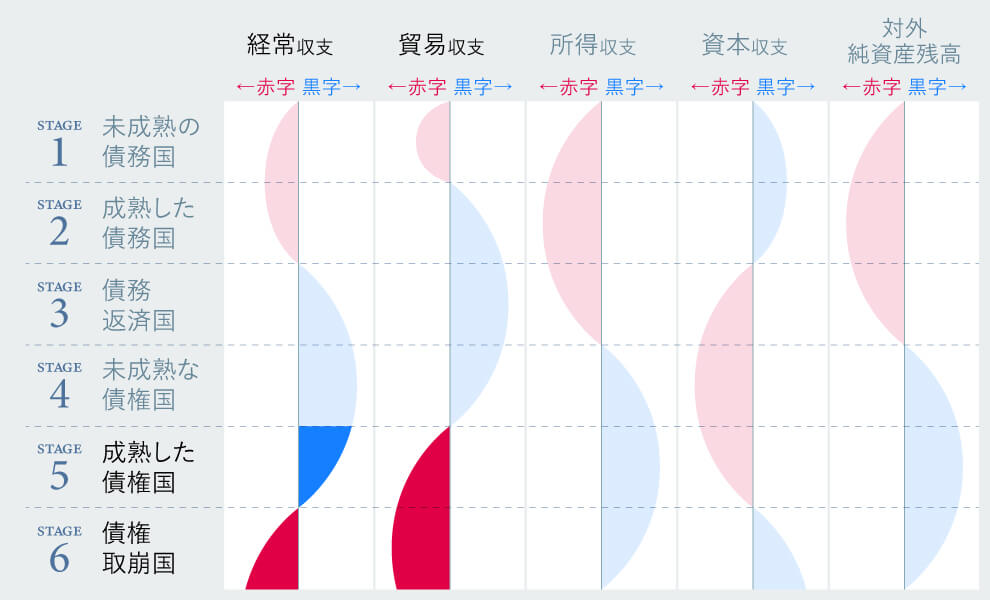 - 成熟した債権国:貿易収支が赤字に転換するが、過去の対外資産からの収入があり、所得収支が黒字のため、経常収支は黒字。