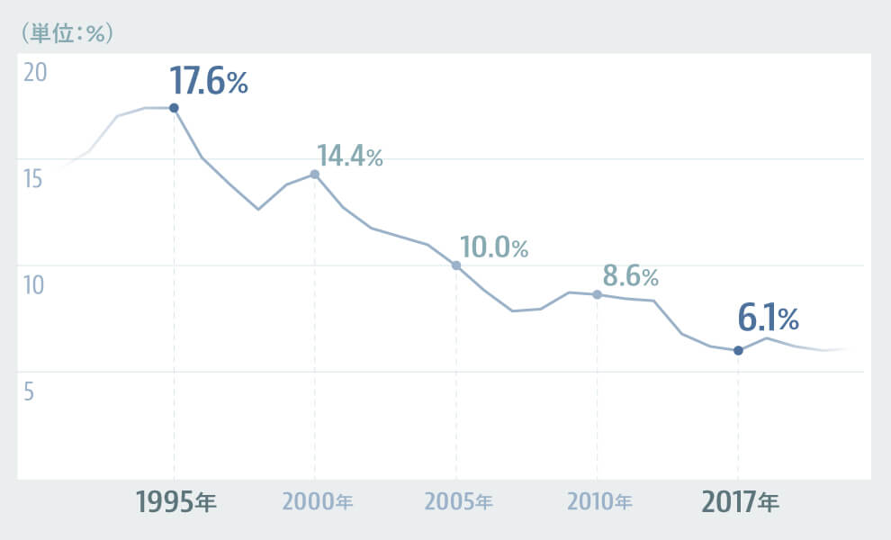 確かに、近年では韓国や台湾など周囲のアジアの国々の台頭などにより、国際的なプレゼンスは年々下がっており、世界でのGDPシェアは1990年代初頭の約17%をピークに2017年には約6%と1/3の水準にまで落ちています。しかし、そもそもそれまでこの小さな島国が17%のGDPシェアを占めていたこと自体が不自然だったのかもしれません。