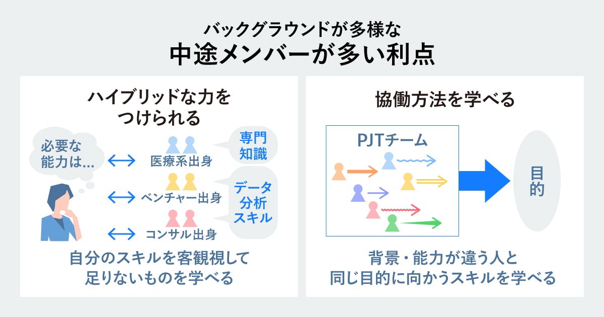 篠原:ハイブリッドな力を付けられることですね。中途メンバーは経歴も様々で、MBBなどの外資戦略コンサルティングファームや、メガベンチャー、製薬会社など多様な業界で活躍されてきた方が集まっています。