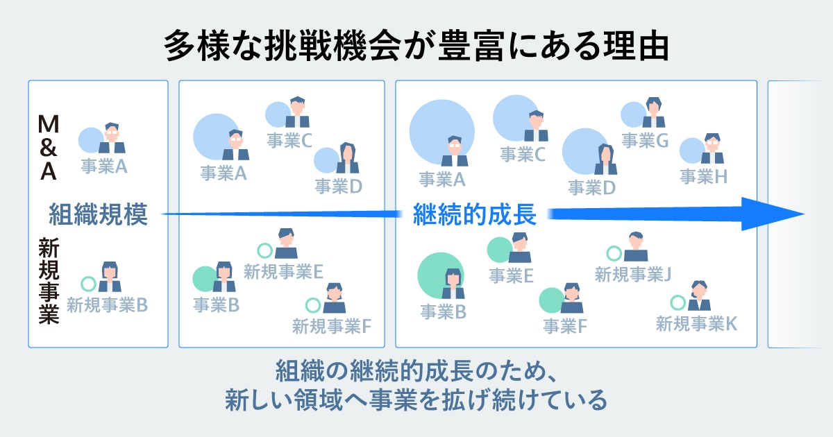 新規事業の企画をやってみたいと言う人は多いですが、企画と実行に求められる力は異なります。プロジェクトの可能性を信じ、チームを牽引する気概を持っている人には、新規事業だけではなく、コンサルタントやグループ会社の経営をサポートするポジションなど、多様な挑戦機会が開かれています。