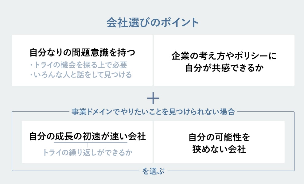 まずは「自分なりの問題意識を持つこと」と、「企業の考え方やポリシーに自分が共感できるか」を大事にしてほしいですね。あとは、僕が大企業を選択した理由でもありますが、就活において、明確にドメインとしてやりたいことを見つけるのは、なかなか難しいことだと個人的には思っています。