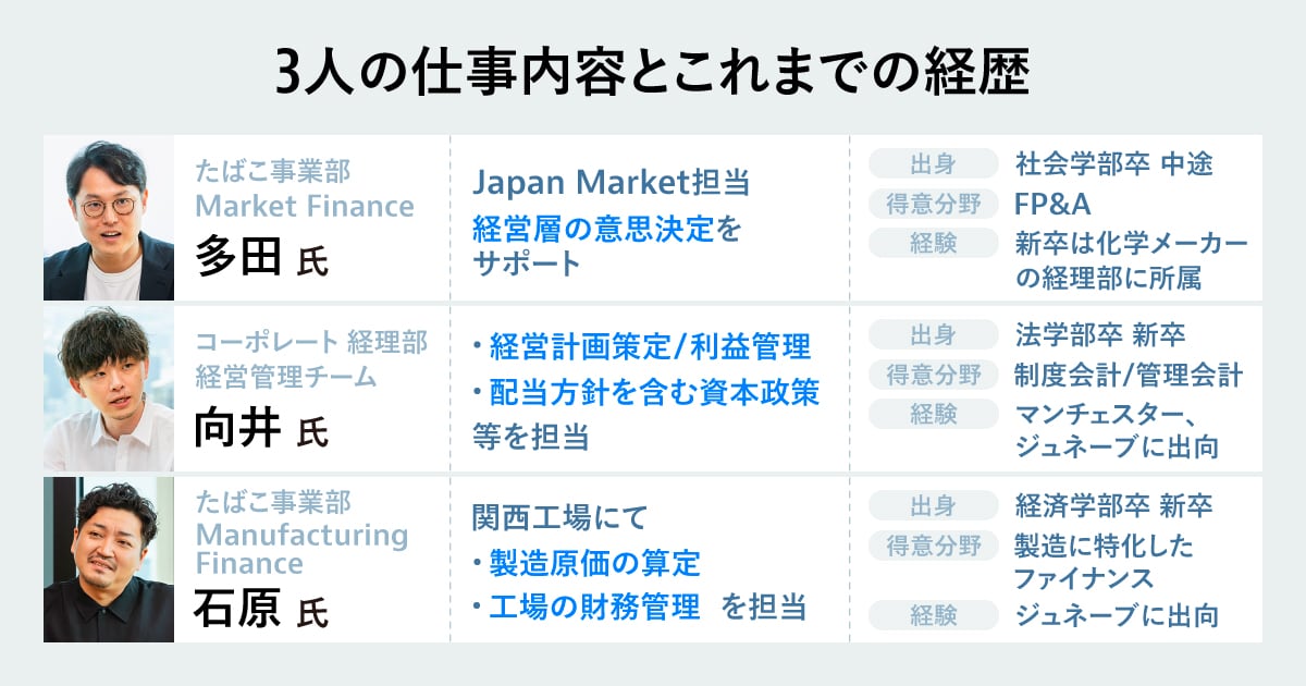 将来は何らかの専門性を身につけて、市場価値の高い人財になりたい。そう考えている就活生の方におすすめなのが「ファイナンス職」です。数字の面から経営の意思決定をサポートするファイナンス職のスキルは、全ての会社で必要とされるもの。しかし気になるのは、実際にどんな働き方をするのか、専門性を身につけていない新卒にも務まる仕事なのかという点です。今回は日本たばこ産業株式会社(JT)でファイナンスに関わる3人から、ファイナンス職の仕事やキャリアについて伺います。