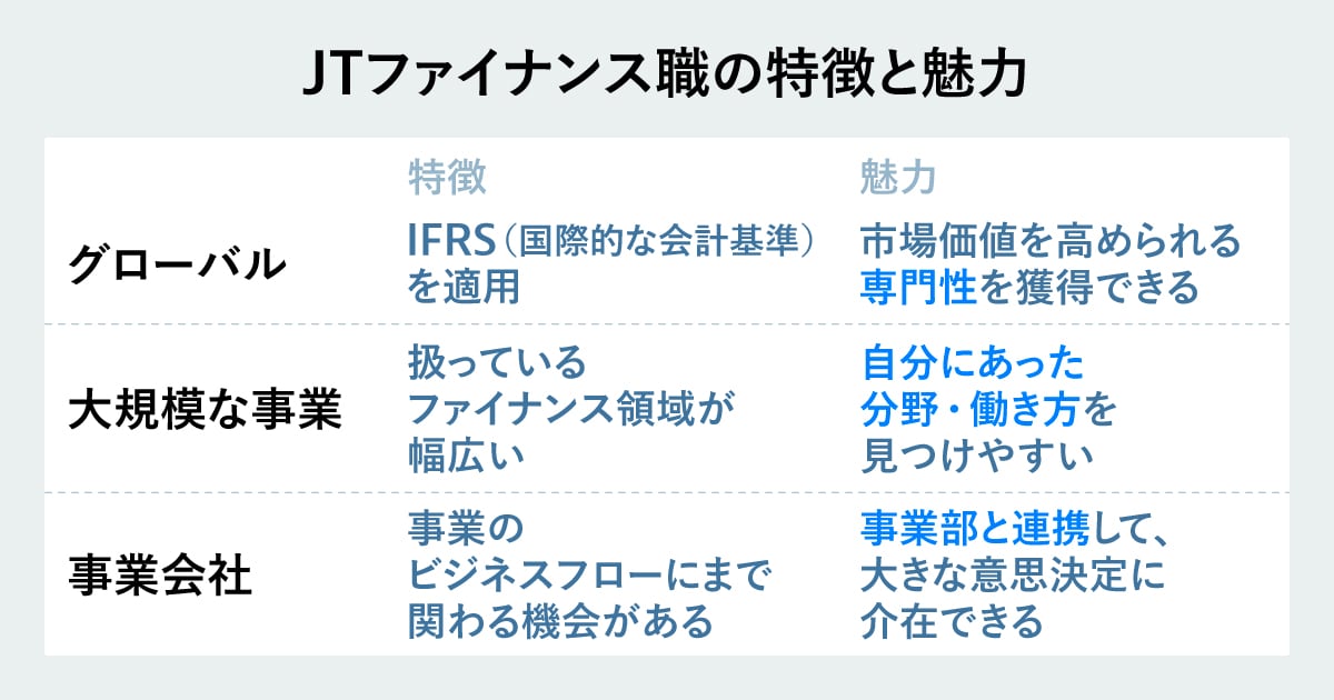 ファイナンスの業務や規模はもちろんですが、何より「どんな人と一緒に働けるのか」は、会社によって大きく異なり、かつ皆さんの今後のキャリアにとって非常に重要な要素です。今回JTのファイナンスに興味を持った方は、まずは面接等で社員と話し、当社の人と社風を体感してみてください。