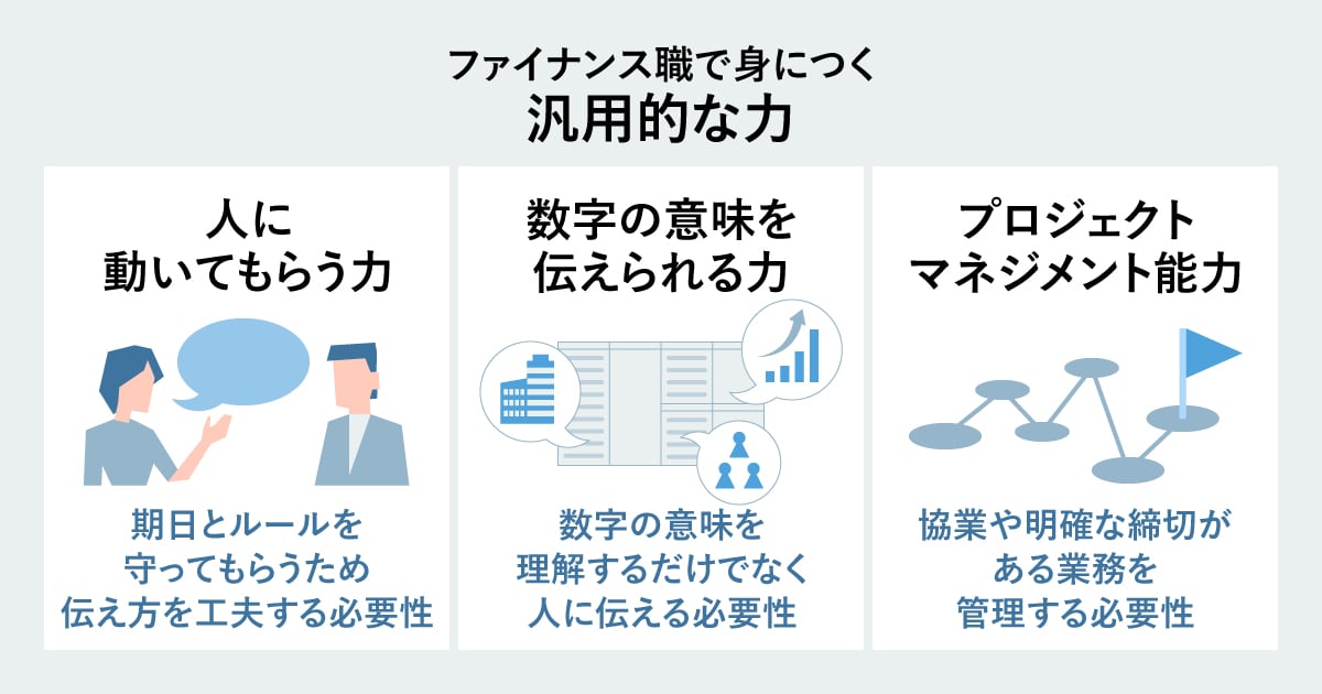石原:ファイナンス職で身につく力は、他の職種にも活かせるものが多いと思います。例えば「人に動いてもらう力」。ファイナンスで扱う数字、例えば予算はすべての部署に依頼して作成してもらわなければならないものなので、期日とルールを守ってもらうために伝え方を工夫しなければなりません。
