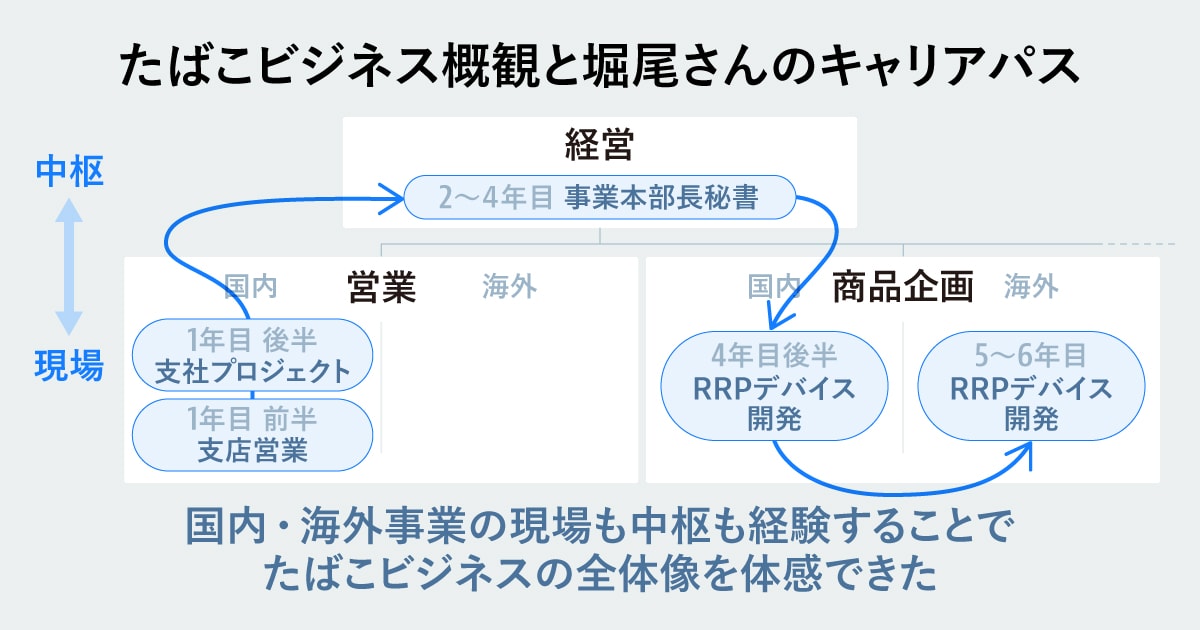 堀尾:希望していました。実は、私のキャリアは私なりに筋が通っているんです。営業でビジネスの現場を体感した後に、事業本部長秘書としてグローバルを含むたばこ事業全体に対するトップマネジメントの視座に触れる。そして商品企画で国内RRP市場という社運を左右するようなビジネスアジェンダに関わり、さらにJTIでグローバルなたばこの実務サイドを経験することで、たばこというJTのコアビジネスの全体像を体感できたと考えています。