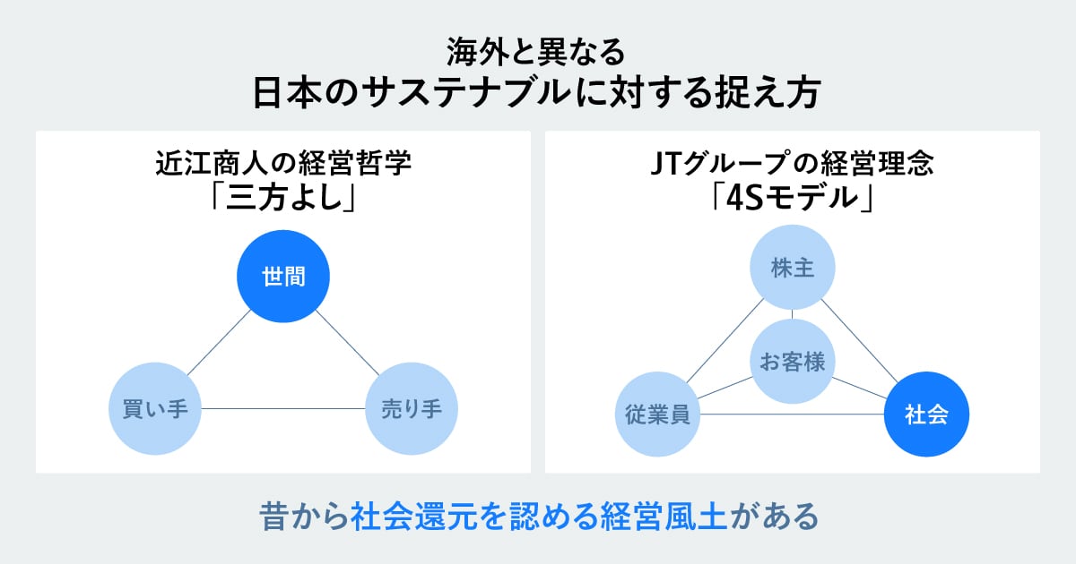 荒木:様々な気づきがありましたが、一つは、日本と世界では企業の「サステナブル」に対する感覚が異なるということです。日本では、近江商人の経営哲学「売り手よし、買い手よし、世間よし」の「三方よし」が広く知られており、JTにも、お客様を中心として、株主、従業員、社会の4者に対する責任を高い次元でバランスよく果たし、4者の満足度を高めていく「4Sモデル」(JTグループ経営理念)があります。