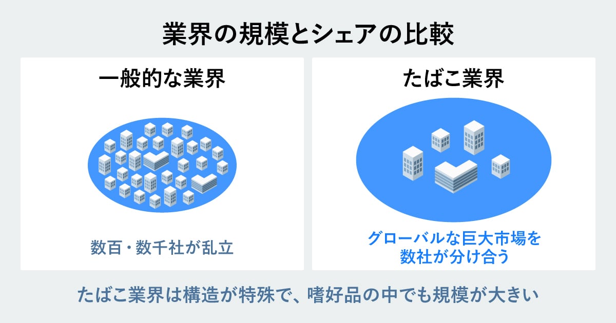 JTは世界130以上の国と地域で商品を販売しており、世界中でたばこを吸われる方は約13億人※6います。数百・数千社がせめぎ合う業界もある一方で、たばこは高度なマスプロダクション※7が早期に世界的に拡大した関係で、世界規模での寡占化が進み、世界で上位数社が巨大市場の大部分を占めているという構造です。