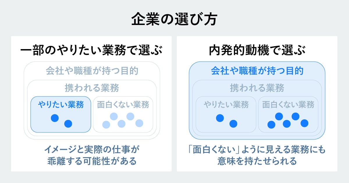 一方で自身の内発的動機、例えば「こういう人間になりたい」「自分の人生に〇〇という意味を持たせたい」などの自分が本当に望んでいることと、その会社や職種が持つ目的とが本質的につながっている状態であれば、「つまらない」「好きではない」ように見える業務にも意味を持たせることが可能になります。