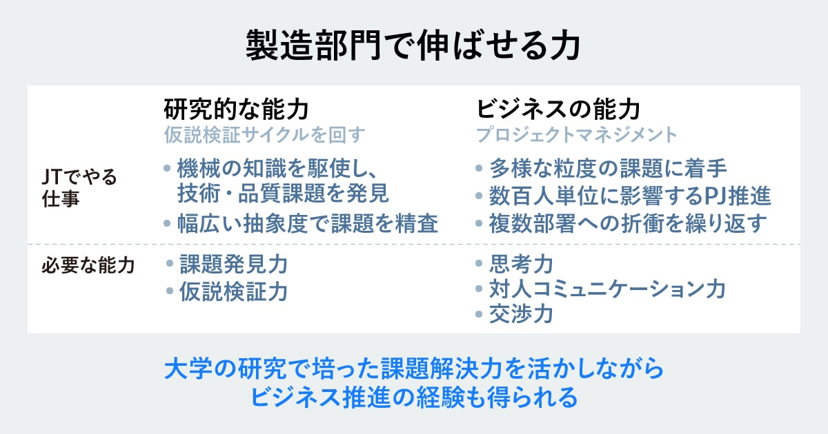 ──理系の方がJTの製造部門で得られる経験やスキルとして、他の会社や部門との違いはありますか?