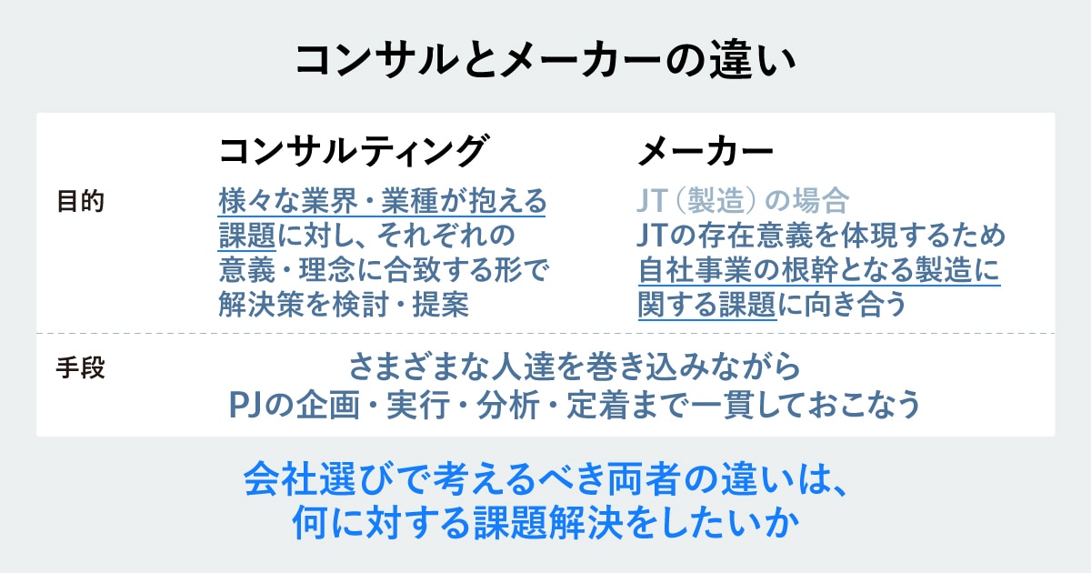 ──ここまでのお話を聞いて、JTの製造部門の仕事は、仮説検証やリデザインの考え方など、コンサルに似ている部分が多いのではないかと感じました。