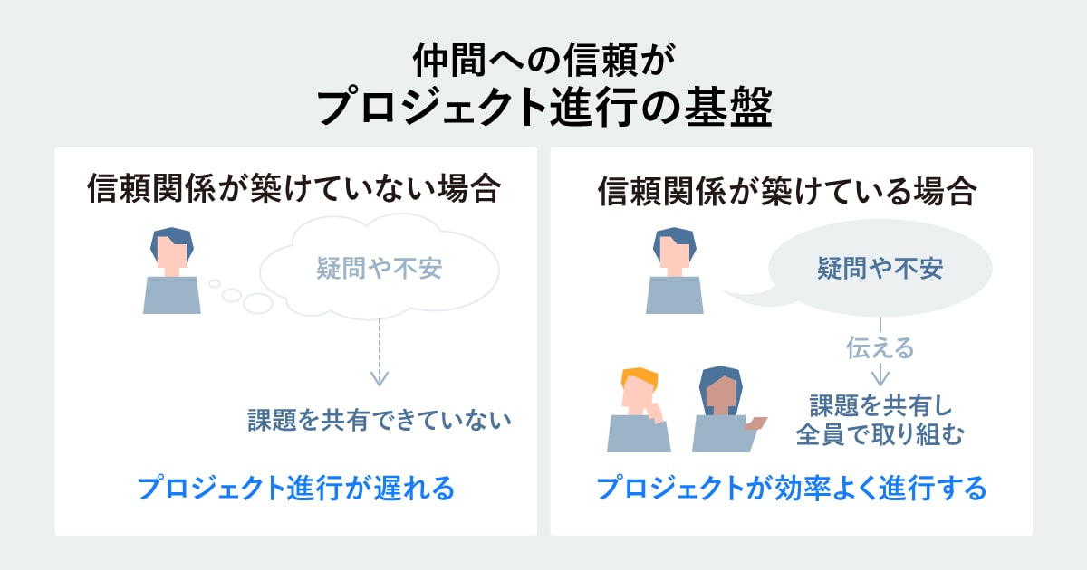 しかし開発では、疑問や不安を正直にメンバーに伝える必要があります。皆の理解が深まれば、お互いの知恵を出し合って解決策を見つけ、プロジェクトをうまく進められるようになるからです。「わからない」と言うことを、弱さを見せることのように感じる人もいるかもしれませんが、そうではありません。開発が成功する要因の半分は、相手に自分が思っていること、考えていることを何でも共有できる信頼関係にあると思っています。