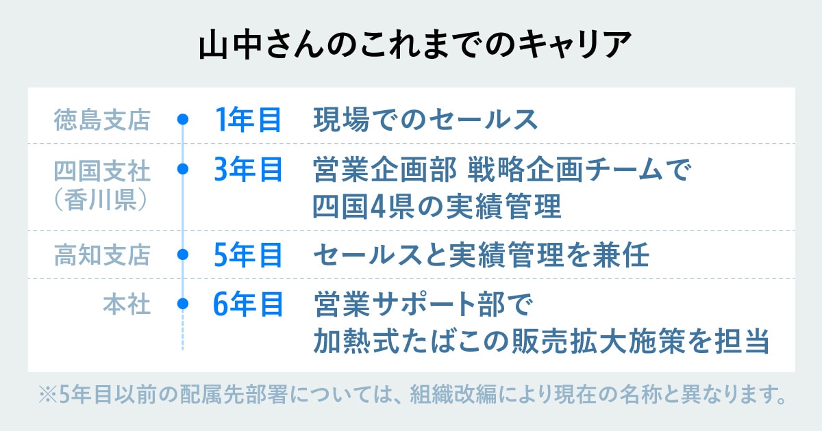 山中:2018年にJTに新卒で入社し、一貫して営業領域に携わってきました。新卒研修後は徳島支店で現場のセールスを担当し、3年目に四国支社の営業企画部 戦略企画チーム※1 で四国4県の実績管理を担当後、5年目で高知支店にてセールスと実績管理担当を兼任しました。6年目の現在は、本社の営業サポート部で加熱式たばこの販売拡大に関する施策を担っています。