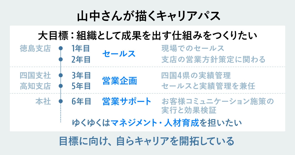 山中:やはり自ら手を挙げ続けたことが大きいと思います。高知支店での実績管理も、本来ならば私よりも経験豊富な中堅メンバーが担うべき仕事だったかもしれませんが、やる気とこれまで積み重ねてきた実績を適切に伝え続けたことで、任せてもらうことができたと思っています。