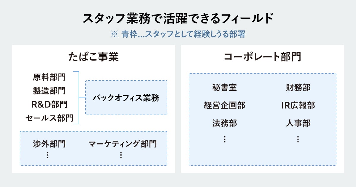 スタッフ業務の社員は、たばこ事業からコーポレートまで、様々な組織で活躍しています。人事、法務、経営企画といったコーポレート機能のひとつを担う業務がある一方で、工場や研究所における生産管理や組織運営といった、現場のバックオフィス業務を含むため、事業に直接携わる仕事も多くあり、本社だけでなく全国の様々な拠点や部門にまで、バリューチェーンに沿うように活躍の場は広がっています。