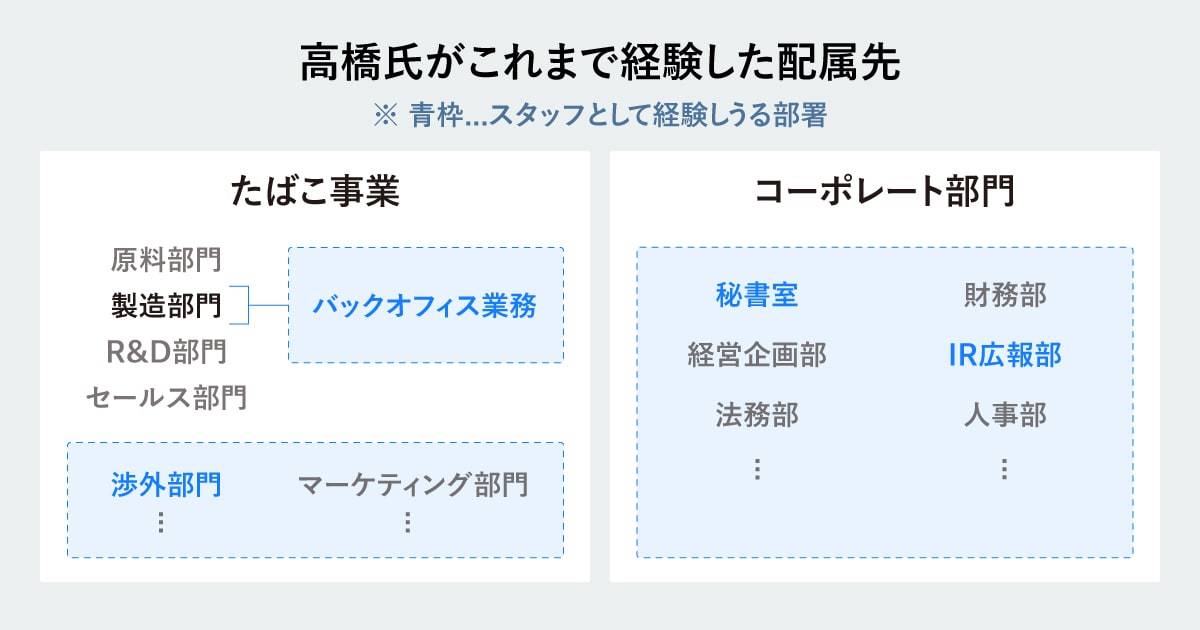 ⸺ 高橋さんは、たばこ事業とコーポレートの両方の複数の部署で、一貫してスタッフ業務を担って来られたそうですね。