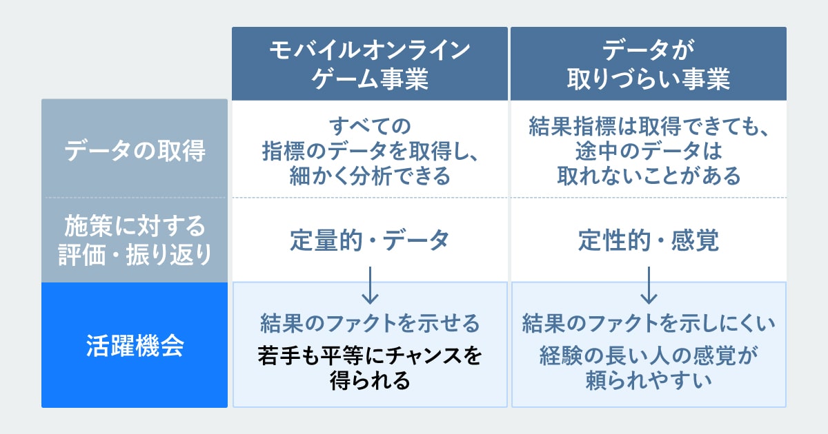 仁平:定量的な評価が難しい事業の場合、経験豊富な10年・20年選手の意見が強くなりがちです。経験や感覚を頼りにする先輩に「これが正しい」と教えられた若手は、データというファクトを示すことができなければ、「それは違う」言い返すことは難しいでしょう。したがって、データで語れる事業のほうが、意欲的な若手が打席に立てる回数が多くなり、結果的に多くの成長機会を得ることができると思います。