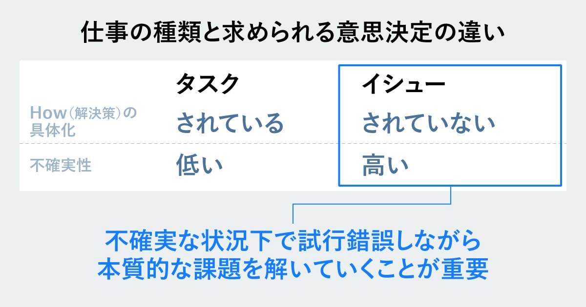 経験すべきは後者ですが、それはどこにでも転がっているわけではありません。「タスク(作業)」ではなく「イシュー(課題)」に向かう過程で生じる、不確実性が高い状況での意思決定こそ、職務遂行能力や精神力が磨かれる成長機会なんです。