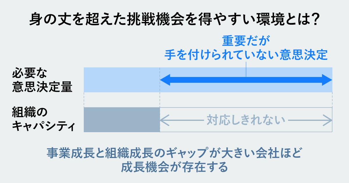 事業成長と組織成長のギャップが大きい会社にはこうした「身の丈を超えた挑戦」ができる機会がごろごろ転がっているので、若いうちから成長したい人はそういう環境に身を置くことをお勧めします。椅子が空くのを待つのではなく、椅子が生まれ続ける環境に身を置くべきと言われる所以は、ここにあるのではないでしょうか。