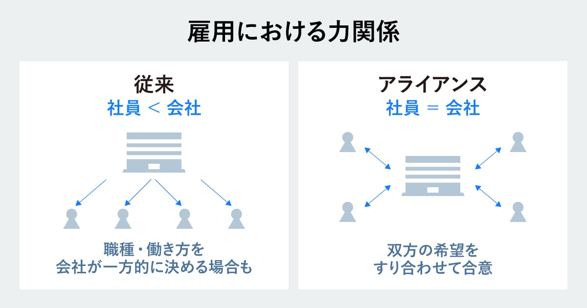 編集部:「アライアンス」という雇用の形を知っていますか。「アライアンス」は、企業から個人に期待する役割と、個人が希望する業務について対等な立場で合意し、雇用関係を結ぶことを指します。リンクトイン創業者のリード・ホフマンが著書『アライアンス』で提唱し、シリコンバレーでも取り入れられている新しい雇用関係です。