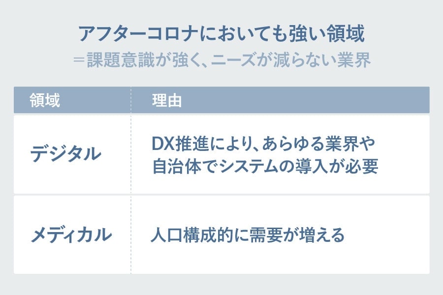 伊藤:アフターコロナにおいては、デジタルとメディカルの領域が強いと考えています。SaaSもそうですが、あらゆる業界や自治体でデジタルを導入する動きが活発化し、システムの需要が高まると、システムを作るwebエンジニアの需要も高まります。