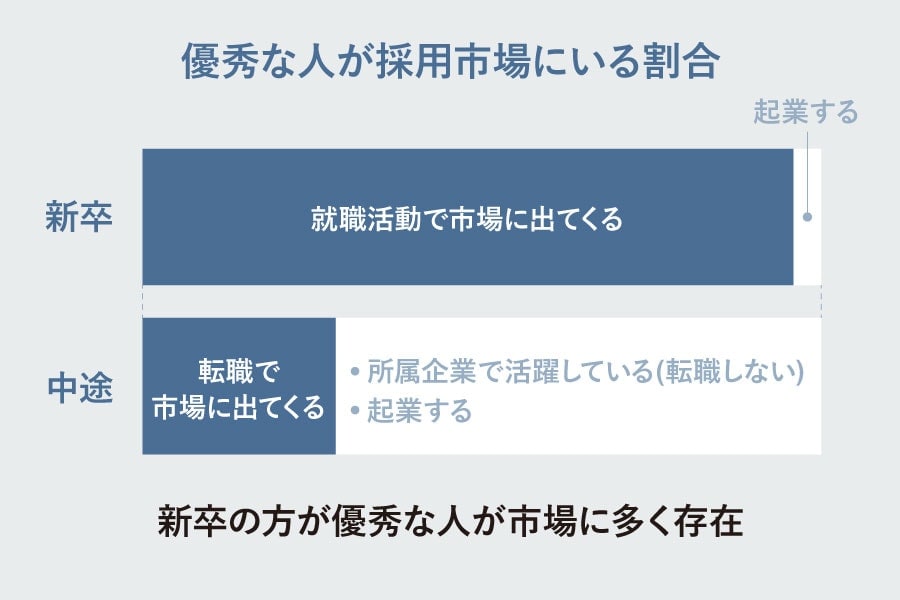 伊藤:本当にずば抜けて優秀な人は既に会社の中で大活躍しているので、転職活動していなかったり、あるいは起業しちゃったりしてますからね。そのようなすごく優秀な人が多く受けに来るタイミングは新卒しかありえないと考えると、新卒でタレントを採りに行くことはかなり合理的ですよね。