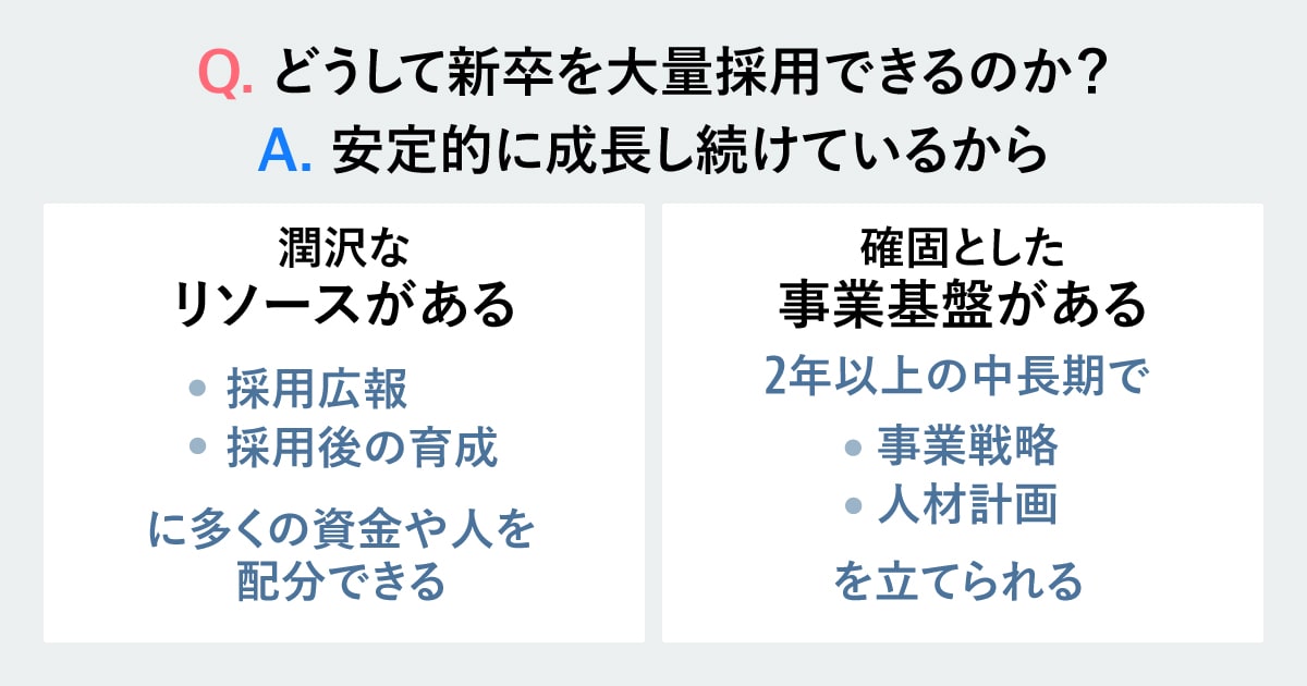 私自身、大量採用をしている企業に対して、安定した企業成長を実現できている優良企業である場合が多いと感じています。なぜなら、前提として企業が新卒学生を多く採用するためには、2つの要素が必要だからです。