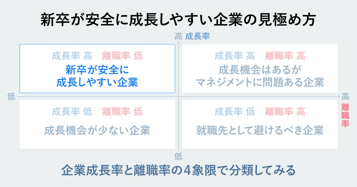 岩槻:企業成長率と社員の離職率を軸にした場合に、その会社が4象限のどこに属しているかで見極めるのが良いと思います。新卒が最も成長できるのは、成長率が高く、離職率が低いグループの企業でしょう。企業の成長率が高ければ、会社全体の仕事量もポジション数も増えるので、新卒が新たな価値創出に関われるチャンスも豊富な場合が多くなります。