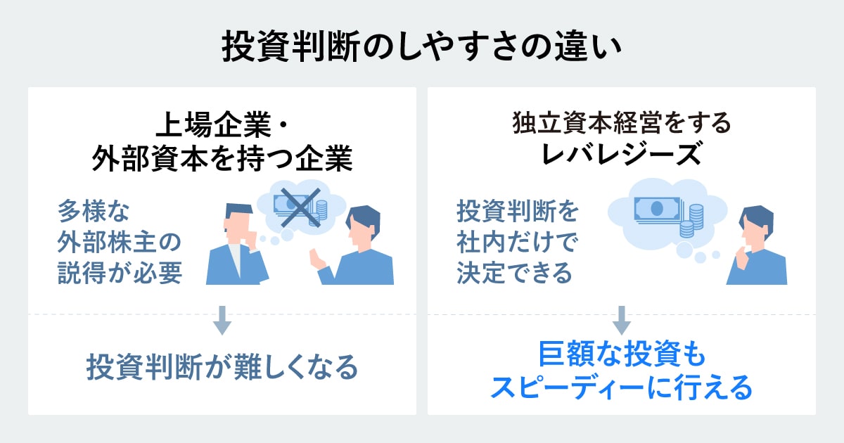 しかし、レバレジーズは創業以来、独立資本で経営してきました。新規事業や人的資本、システム、広告など、その時々で必要なものへの投資判断を社内だけで決定することができるため、年間100億円以上という巨額な投資もスピーディーに行うことができているのです。