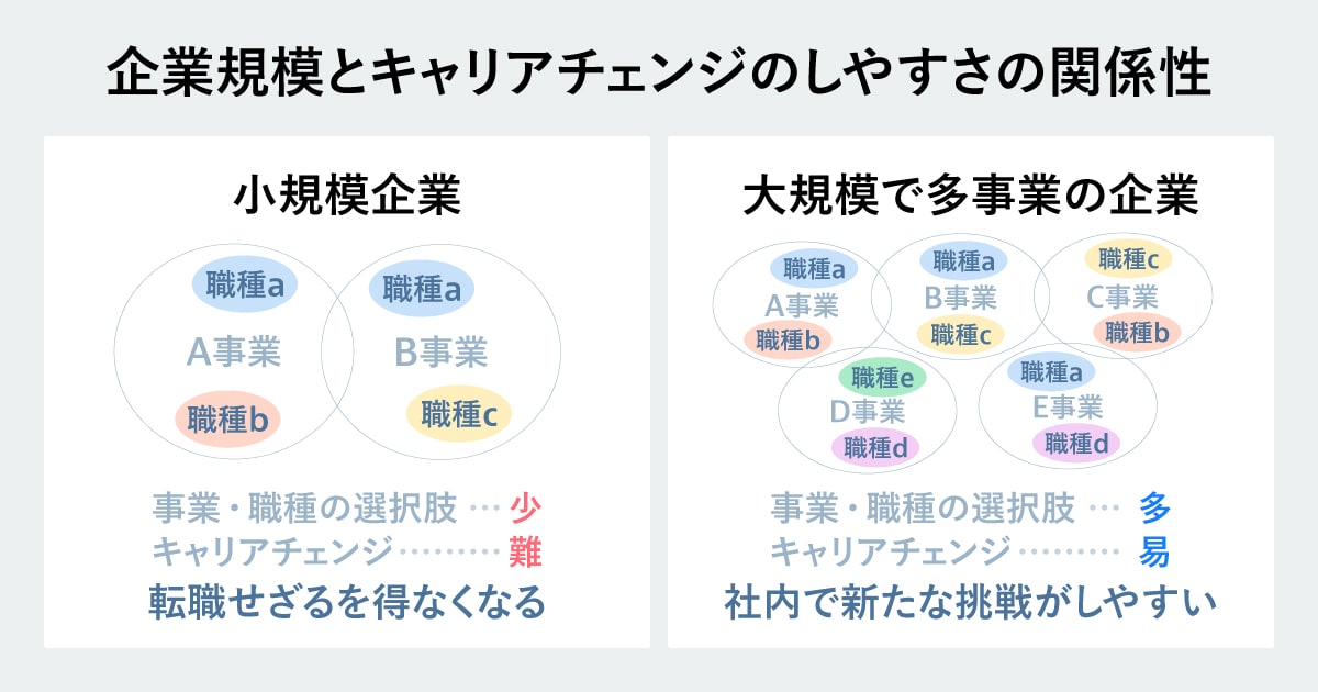 また小規模ベンチャーとの違いとして、社内でのキャリアの選択肢の幅広さがあると思います。小規模の会社では、働く中でいざ別の事業や職種に挑戦してみたいと思っても、簡単には異動できません。そもそもその会社の中に挑戦してみたい部署や職種が存在しない可能性も高く、転職を余儀なくされるパターンが増えるでしょう。当然、不要な転職を重ねることは中途市場から歓迎されません。