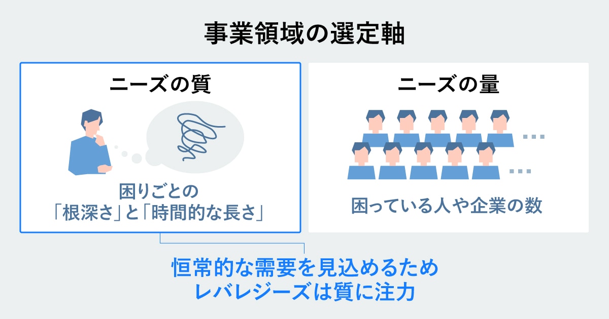 藤本:ニーズの質は、困りごとの「根深さ」と「時間的な長さ」で定義しています。反対に、ニーズの量は困っている人や企業の数のことです。つまりレバレジーズでは「根深い、または長期的なニーズがある領域」を吟味して事業を展開しているということです。