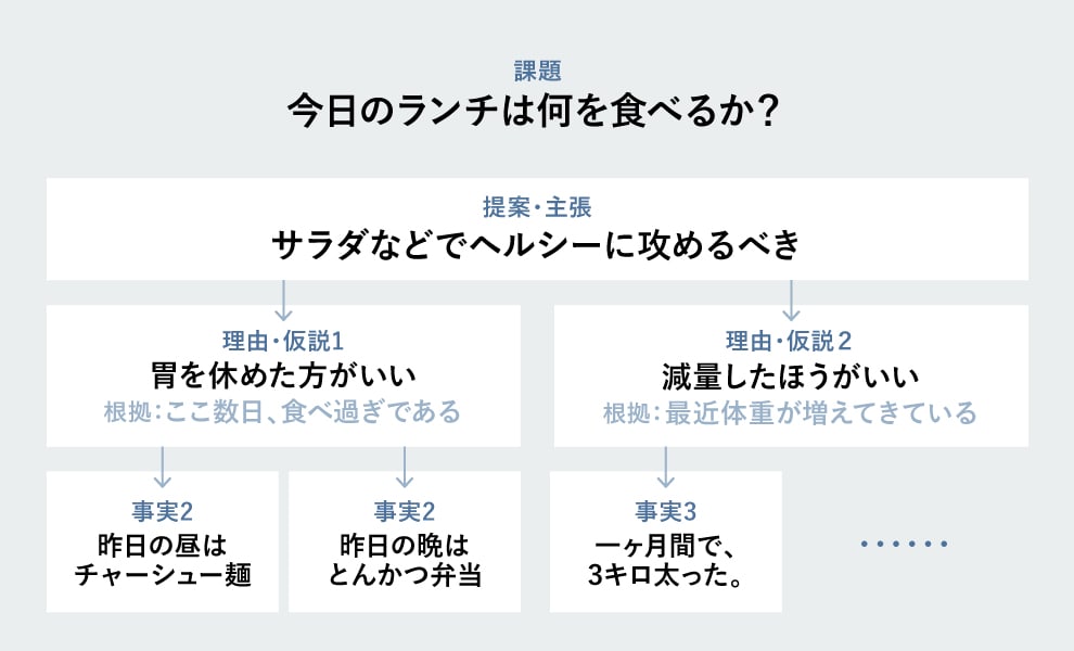 今回は日常におけるカジュアルな例を示しましたが、ビジネス全般において同じことが言えます。就活で誰もが習得するであろうロジカルシンキングのスキルを駆使して、相手の人物像や状況を想像し、想定しうる事実を網羅的にできるだけ多く押さえましょう。そのうえで相手のニーズに対する仮説を構築し、それを捉えた主張を作れるかが重要です。