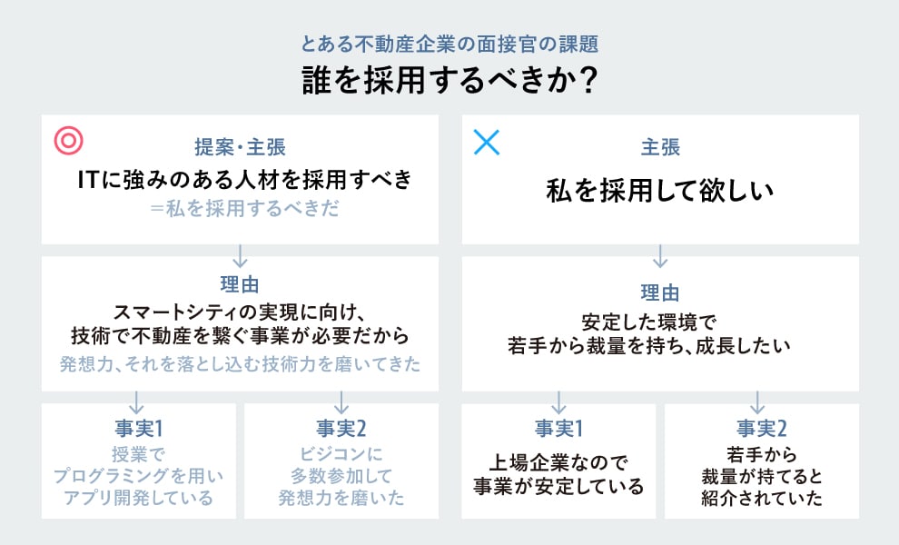 さて、面接の場に話を戻すと、面接官の考えていることは「この人物を採用すべきか?」であり、みなさんが出すべき主張は「私を採用すべきである!」でしょう。