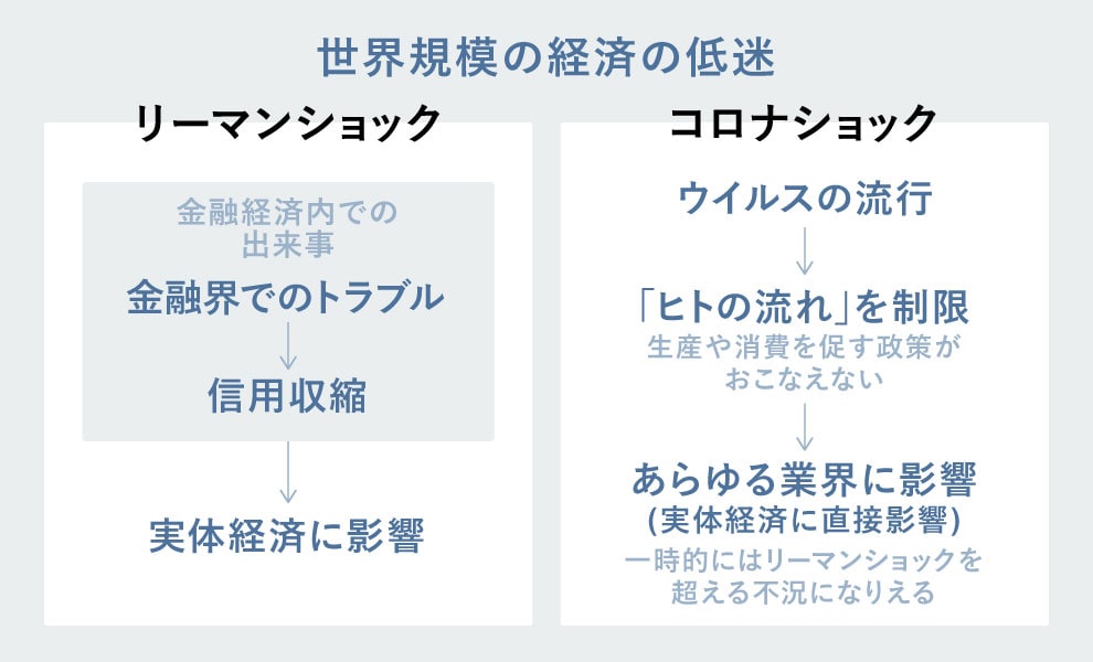 しかし、今回はウイルスとの戦いで「ヒト」の流れを制限しなければならず、文字通り人に依存する生産や消費を促すような政策を行うことができません。その結果、あらゆる業界に影響が出ているため、一時的にはリーマンショックを超える不況となるでしょう。
