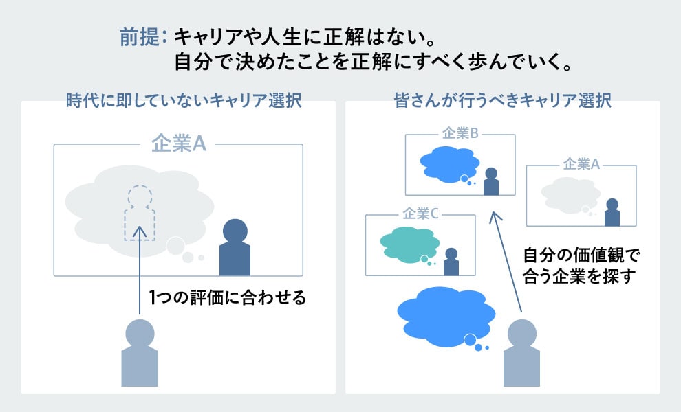 キャリアや人生に正解はありません。自分で決めたことを正解にすべく歩んでいくのが重要です。どの領域でキャリアを築くのがいいかという話もそうですが、みなさんは正解を探しすぎな傾向にあると思います。他人や世間のものさしを気にしすぎず、自分の頭で、自分の価値観で、やるべきことを考えましょう。