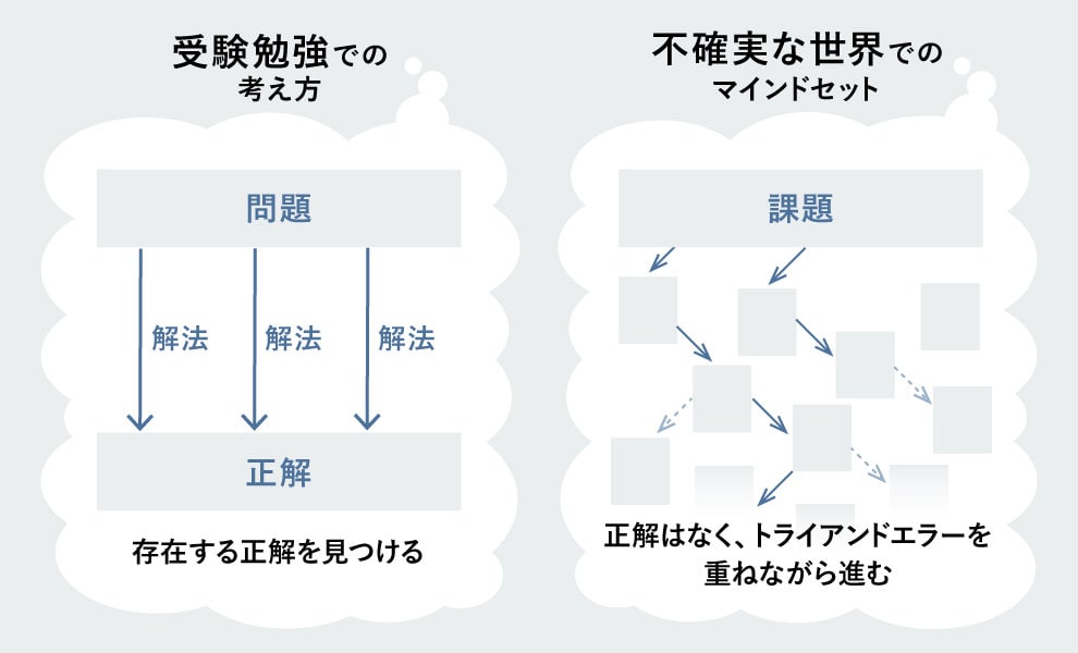 織田:スキルの前に「考え方」の鍛錬が大切だと考えています。正解はないことを受け入れて、間違えたら軌道修正すればいいというマインドで物事に取り組むことが大切です。皆さんが一生懸命取り組んできた受験勉強は、そのようなマインドが身につかないからこそ、難しく感じるのでしょう。現実世界の前提条件は頻繁に変わりますし、問題集に取り組んでから本番に挑むこともできません。