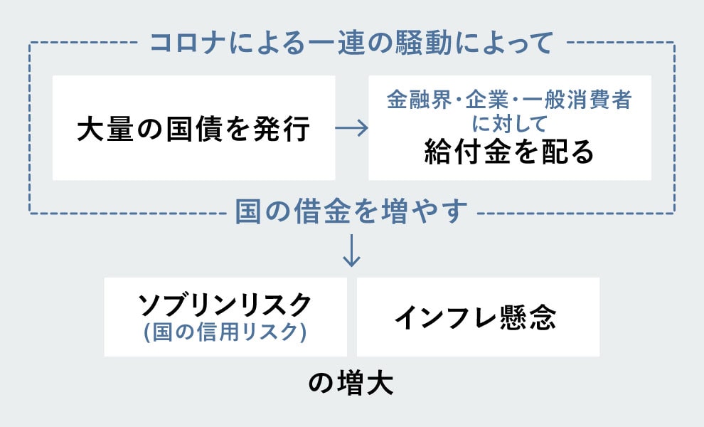 各国は一次対応として、金融界や企業のみならず、一般消費者にも給付金といった形でお金を配らなければなりません。そのために大量の国債を発行し、借金を増やしていきます。これにより、国債が紙切れ同様になるソブリンリスク※1とインフレ懸念が増大します。