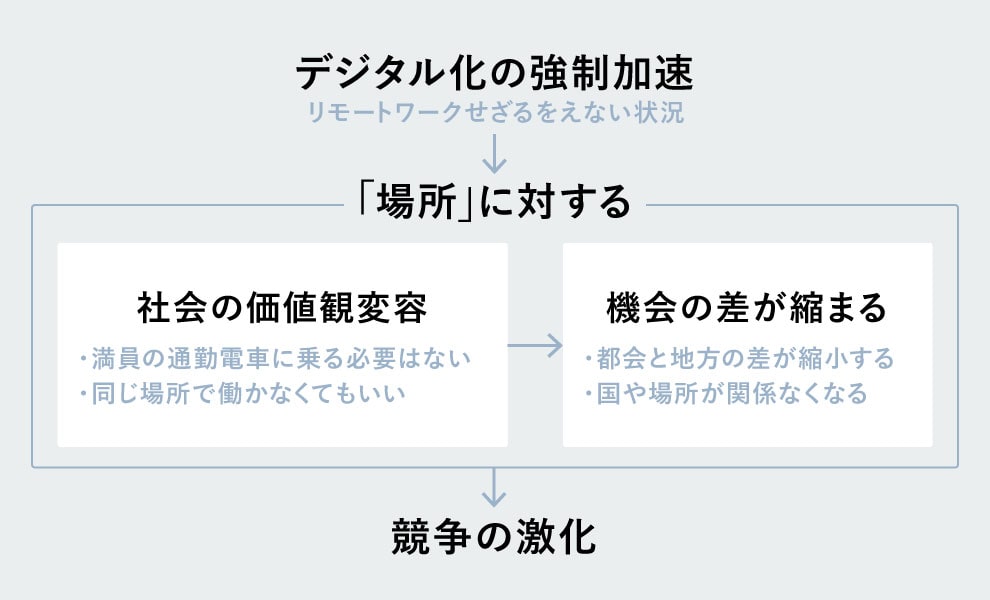 グローバルでも同様の変化が起こっています。例えば私は東南アジアのいくつかのプロジェクトでも仕事をしているのですが、オンラインのコミュニケーションを用いることでこの状況下でもほぼ滞りなく進捗しています。地理上の優位性という概念がなくなり、アウトプットで評価がなされることで、グローバルでの競争もますます激しくなるでしょう。
