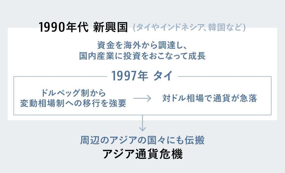 当時の状況を少し説明しましょう。1990年代、タイやインドネシア、韓国といった新興国が資金を海外から調達し、国内産業に投資を行って成長していました。しかしドルペッグ※3を行っていたタイで変動相場制への移行を強いられ、対ドル相場で通貨が急落してしまいます。それが周辺のアジアの国々に伝搬したのが、1997年のアジア通貨危機です。