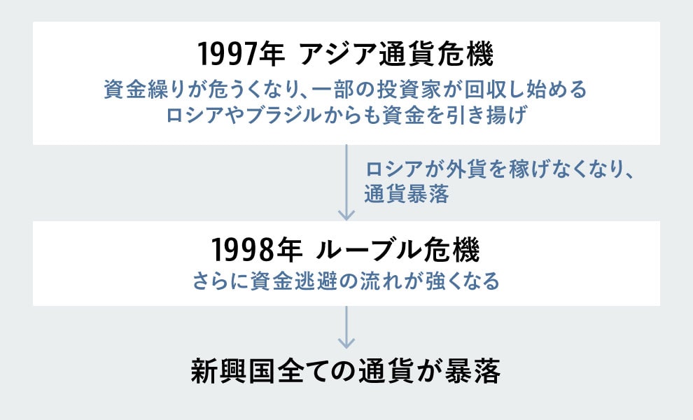 これによって資金繰りが危うくなり、回収し始めた投資家が、1998年に入るとロシアやブラジルからも資金を引き揚げていきます。アジア通貨危機の影響で外貨を稼げなくなっていたロシアでは、この資金引き上げを発端にルーブル危機が起きます。これは世界規模に広がり、世界中の新興国からの資金逃避の流れを引き起こしました。これにより、これまで世界の経済のけん引役と思われていた新興国の経済成長が、しばらくの間滞ることになりました。
