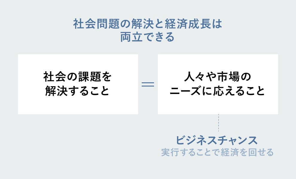 質問の答えとしては、社会問題の解決と経済成長は相反せず、両立できるものだと考えています。社会の課題を解決することは、すなわち人々や市場のニーズに応えることです。そしてニーズがあることはビジネスチャンスそのものなので、これを実行することで経済を回すことができるからです。