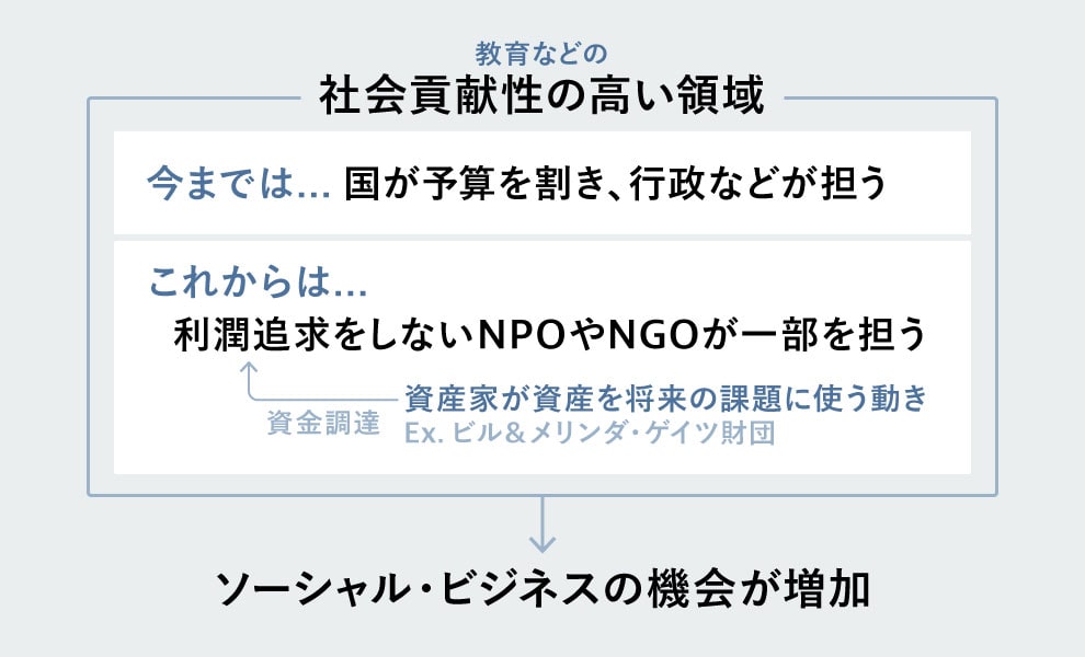 また、世界の強弱が鮮明になると、途方も無いお金持ちも増えていきますが、一部の富裕層では、自らの資産を将来の課題に使う動きが生まれています。マイクロソフトの創業者であるビル・ゲイツ氏も、奥様と基金を立ち上げて莫大な額の寄付を行っていますよね。NPOやNGOの団体は、このような資金を上手に使うことで、これまで行政などに頼っていた課題解決の一部を担うことができるでしょう。