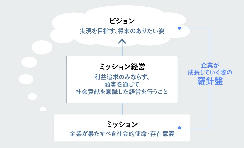 次に「ミッション」とは、企業が果たすべき社会的使命であり、存在意義です。自社は「何のために存在し、誰にどのような価値を提供するのか」を明確にしたもので、日々推進し続けます。また利益追求のみならず、顧客を通じて社会貢献の実現も目指す考え方を「ミッション経営」※1 と言います。