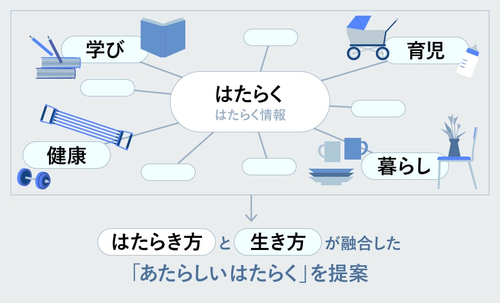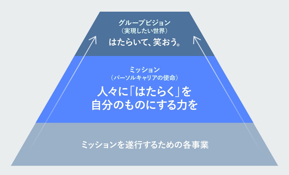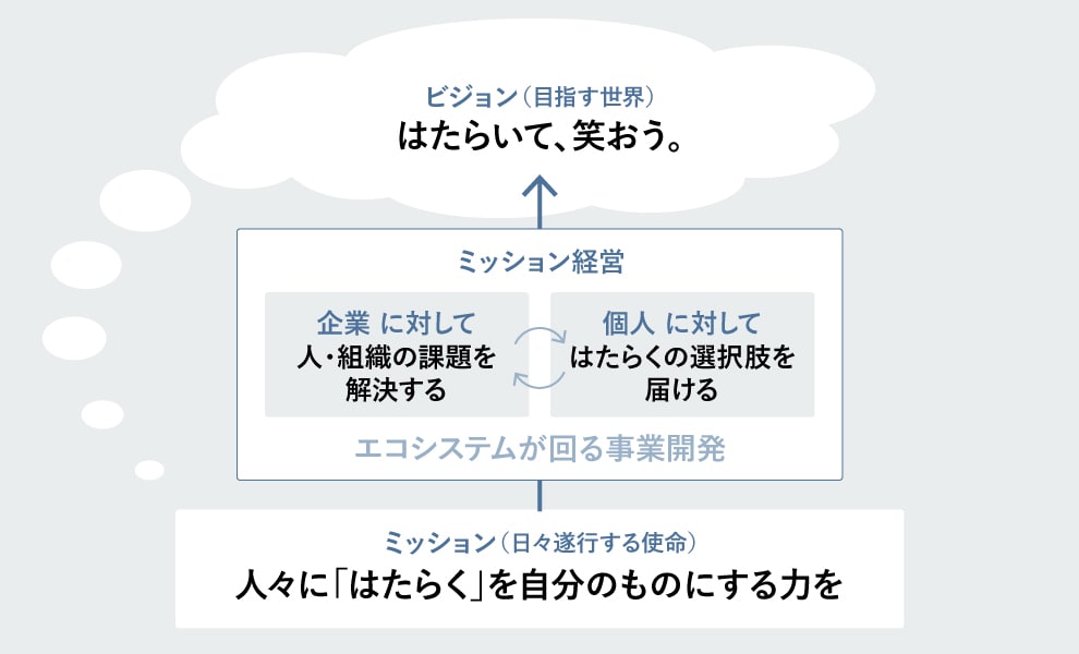 森:ビジョンから全ての事業を考えています。グループビジョンは「はたらいて、笑おう。」ですが、「はたらくことは、生きること」と捉えています。また、ミッションは「人々に『はたらく』を自分のものにする力を」ですが、このミッションを推進するためには、「はたらき方」と「生き方」が融合するような、充実した「あたらしいはたらく」を創造することが必要だと考えています。