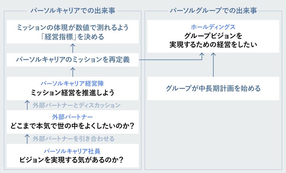 我々は「儲けたいだけじゃないんです。じゃあ、それを乗り越える経営って、どうやっていったらいいんですか?」とお聞きして。児玉さんとディスカッションしていくなかで「ミッションを中心に据えた経営を推進した方がいい」と、峯尾(当時パーソルキャリア社長)が思い至りました。