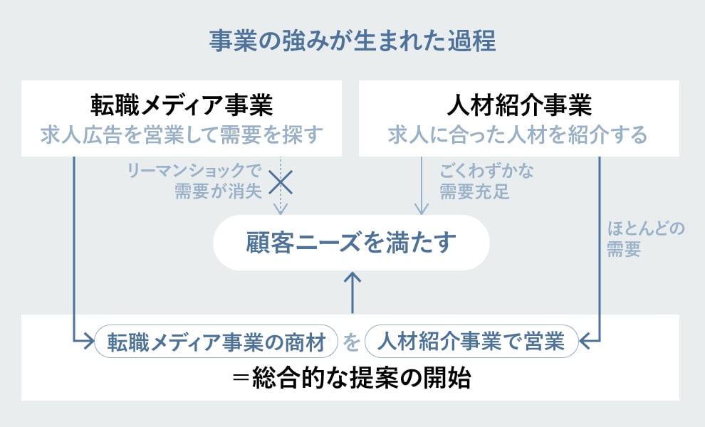 一方で転職メディアは、当社が運営する転職メディア「doda」に対して、企業が求人を掲載し、ユーザーがメディアを通じて求人に応募することで、採用活動および転職活動をサポートするサービスです。この転職メディアは、リーマンショックの時には一時的にお客さまからの需要が減少してしまいました。でも、採用に関する需要がすべて無くなってしまったわけではなく、人材紹介のサービスには、「自社のニーズに合う転職希望者を紹介してほしい」というお客さまからお声掛けがあったんです。