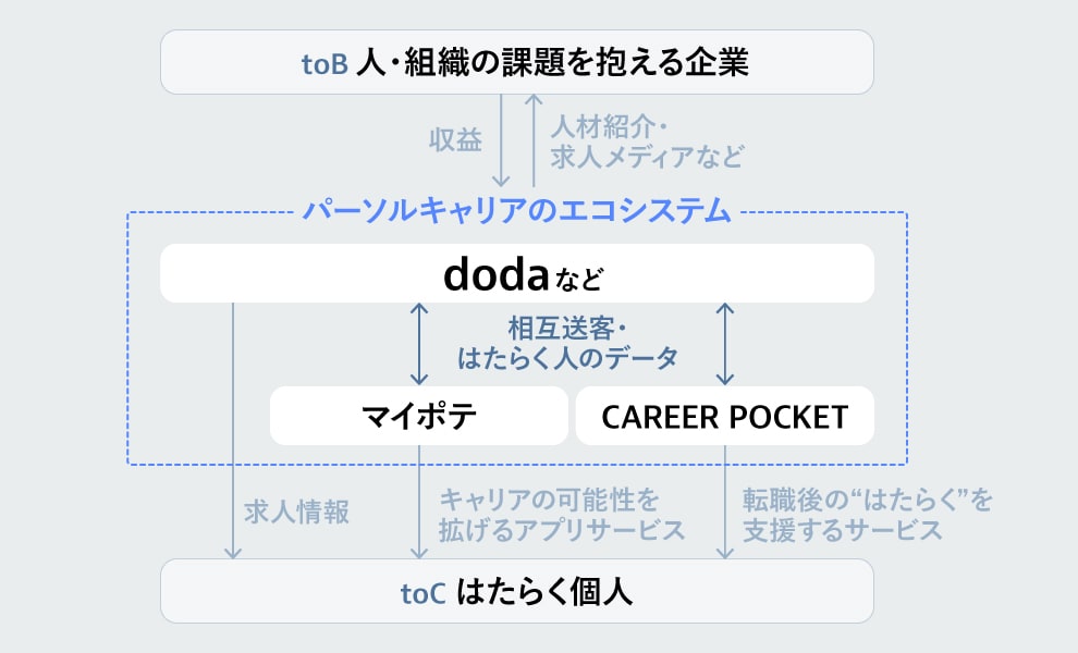 例えば、2020年より提供開始した、転職後の“はたらく”を支援するサービス「CAREER POCKET」においては、サービス単体でマネタイズをしていませんが、「doda」を含む既存サービスへの送客や、データの共有を考え、まさにエコシステムとして運営しています。