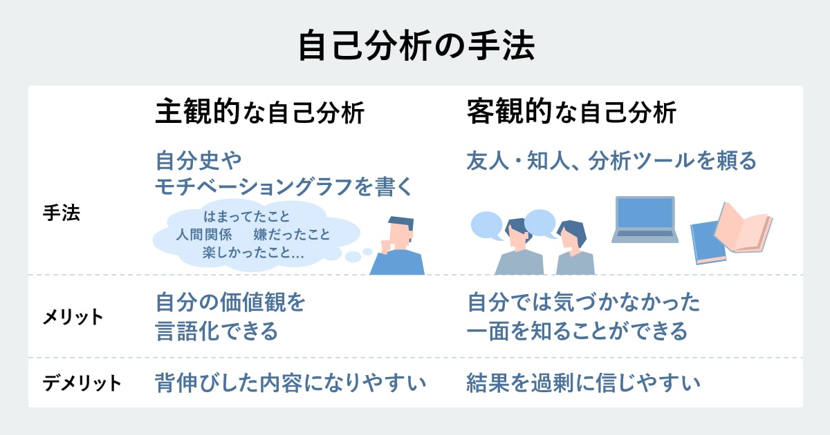 次に、客観的な自己分析は、友人・知人、分析ツールに頼る手法で行う自己分析です。この手法では自分では気付いていなかった一面がわかる一方で、結果を過剰に信じることで本来の自分と乖離した自分像をつくりかねないという弱点があります。