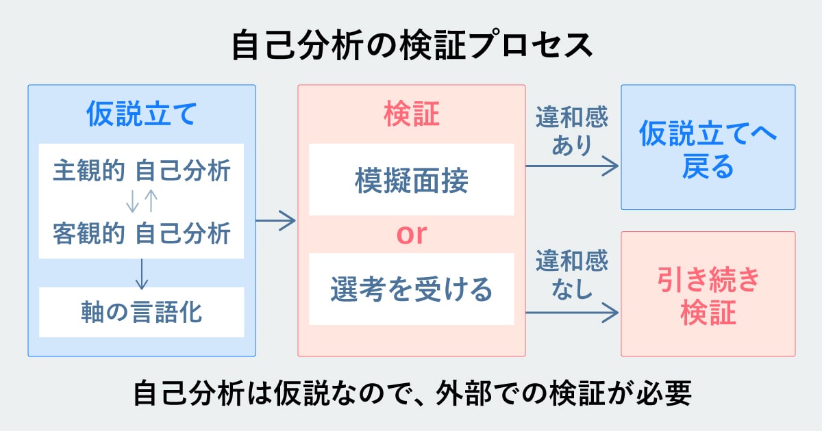 ここで重要なのは、言語化できた内容はあくまで仮説であり、検証のプロセスが必要という点です。「本当にそうなのか?」を、外部からのフィードバックや意見を取り入れ検証し、違和感があったのならば、もう一度自己分析に立ち返りましょう。