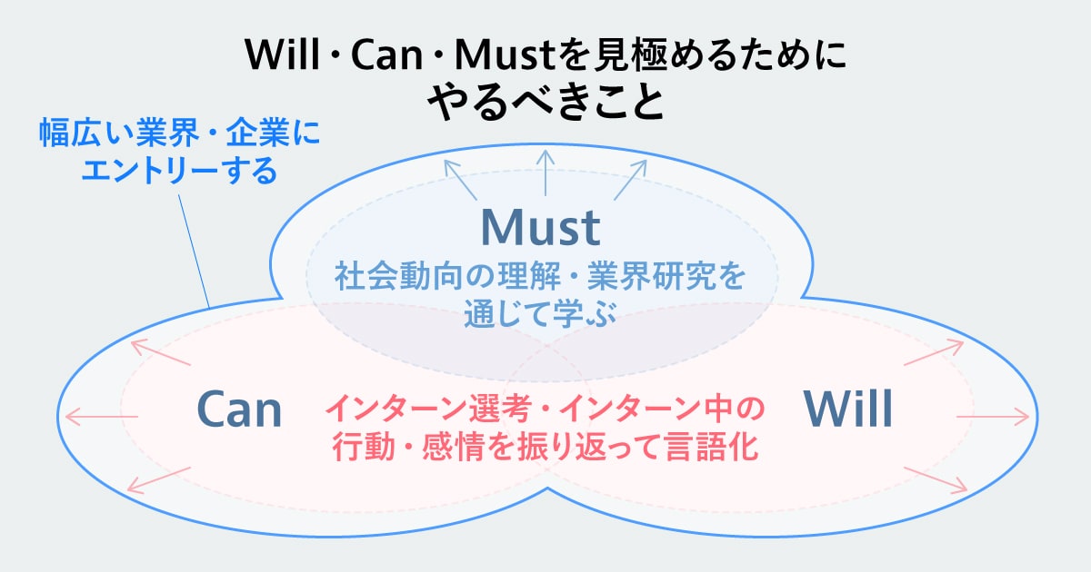 - 知識を増やして興味範囲を広げ、自分に合う企業を探すために、夏のうちは受ける業界・企業を絞らずに幅広くエントリーする。(Will・Can・Mustの面積を大きくする)